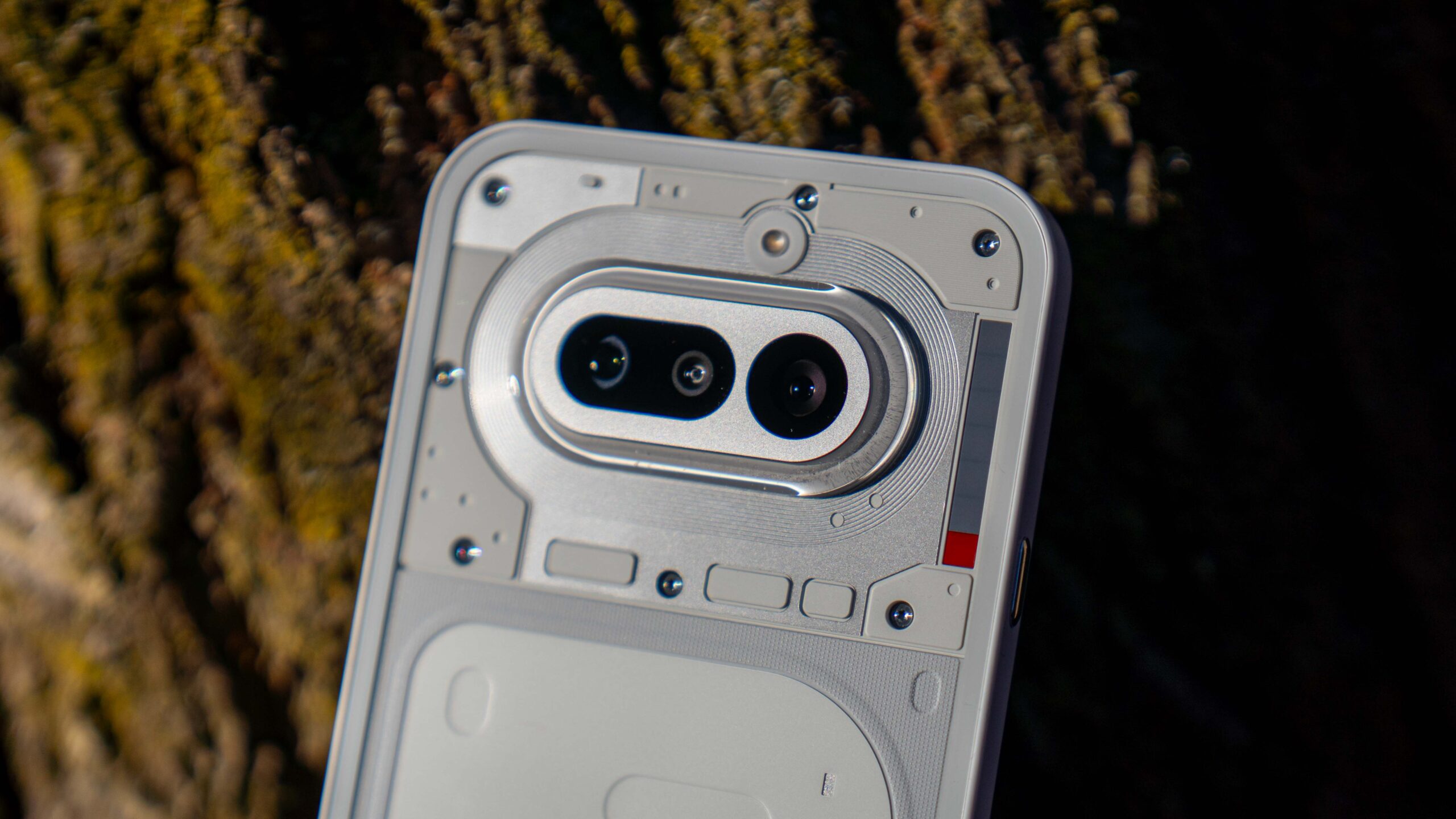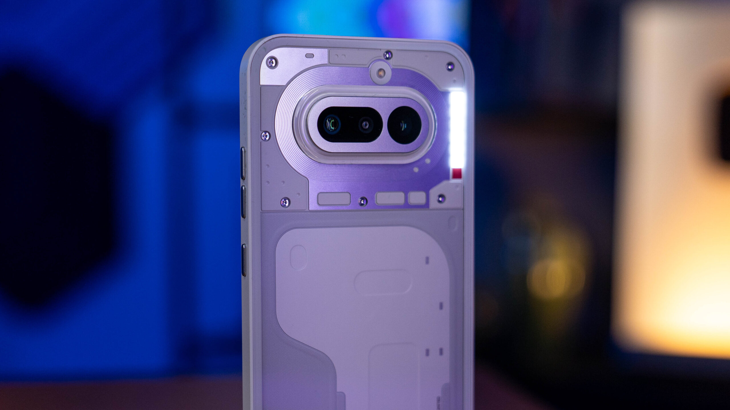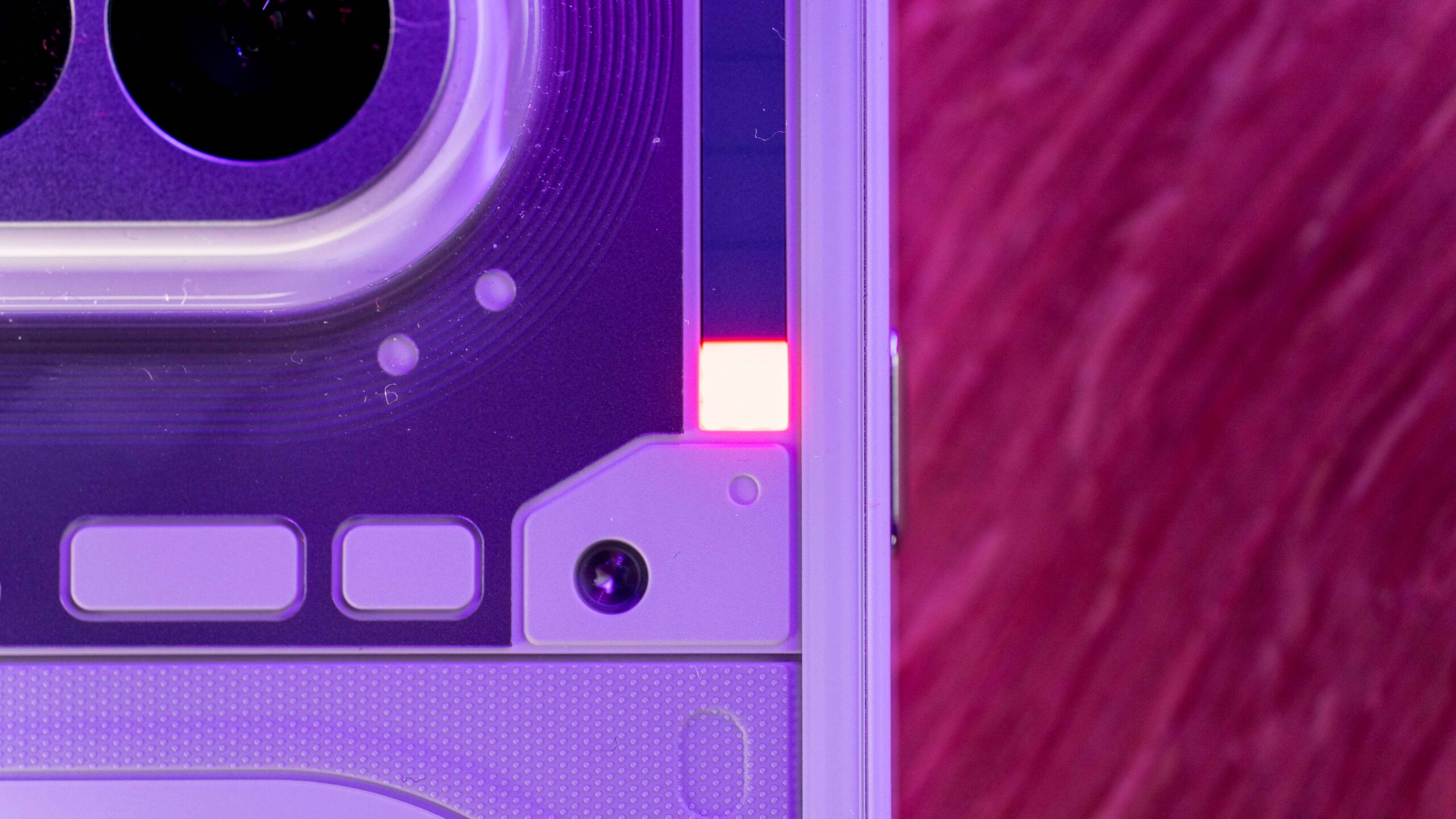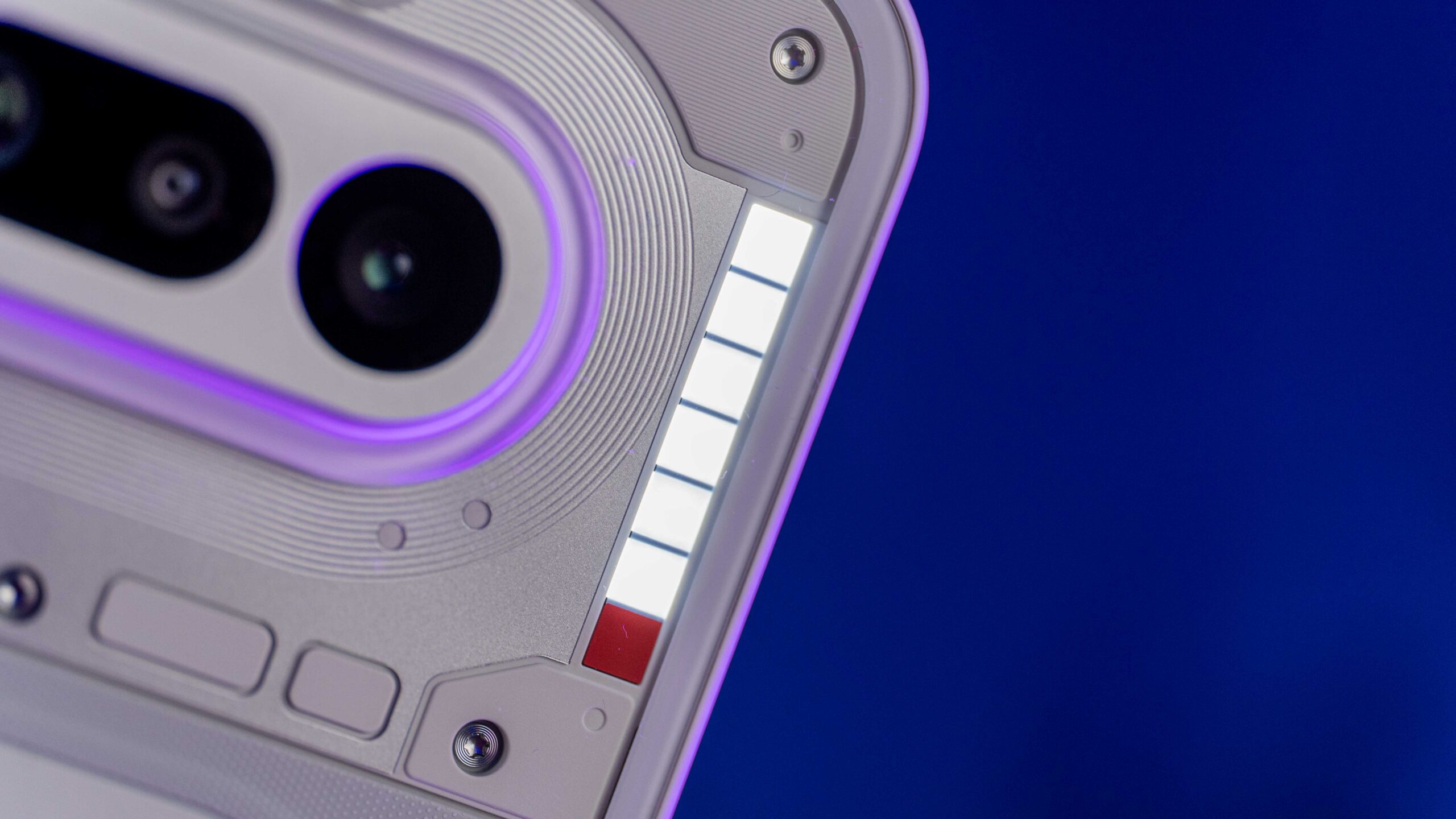 Do testów trafił mi się klasyczny, biały wariant urządzenia. I choć to właśnie wokół różowej wersji z jej intrygującymi odcieniami na pleckach narosło najwięcej szumu, biały model ma w rękawie świetnego asa: czerwoną diodę informującą o nagrywaniu wideo, która na jasnym tle fenomenalnie kontrastuje i od razu przyciąga wzrok. Elementem wyróżniającym jest tu oczywiście świecący, nieco kanciasty Glyph Bar. Każda z diod posiada trzystopniową regulację jasności, co pozwala mi idealnie dopasować intensywność świecenia do pory dnia.