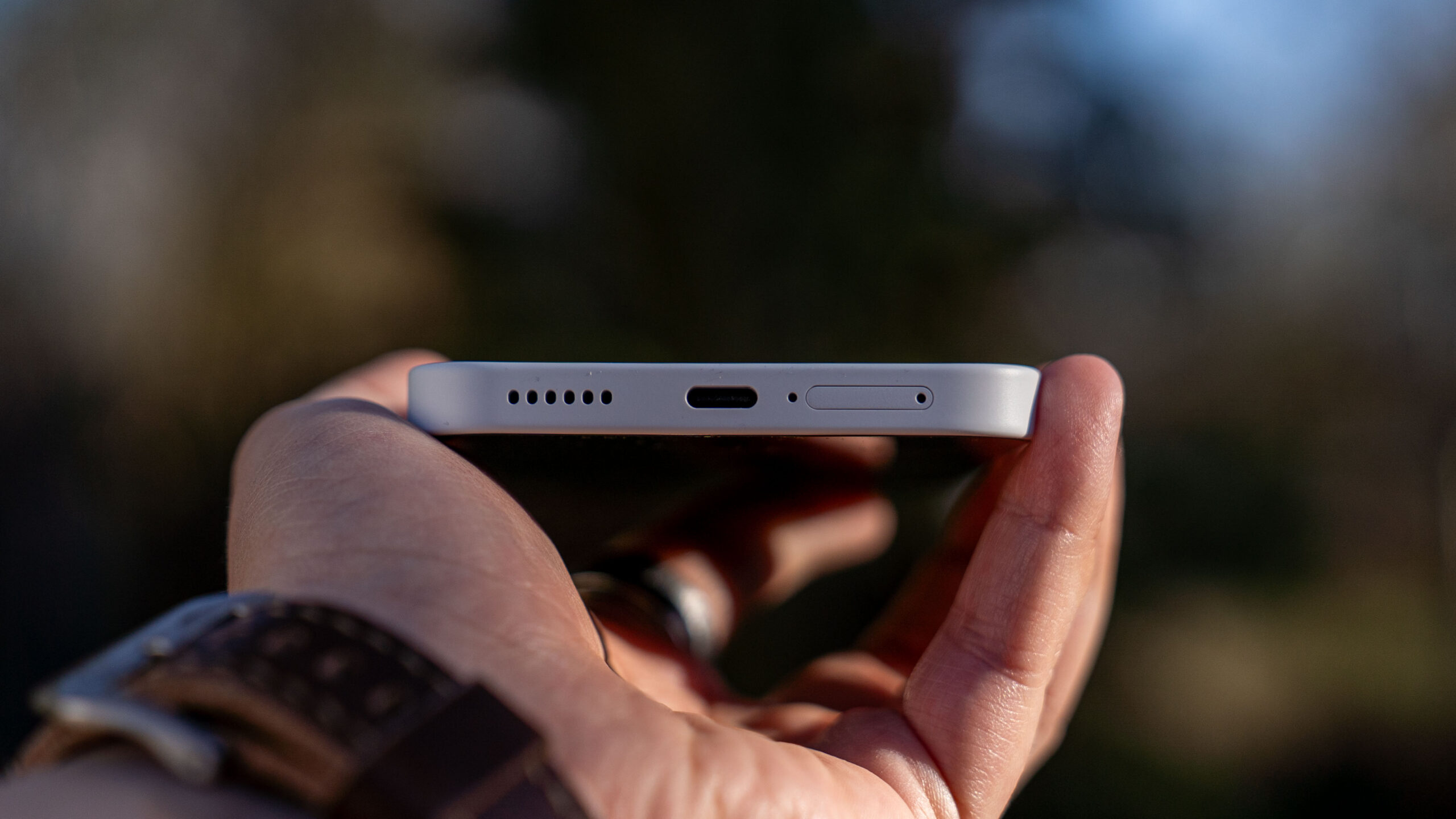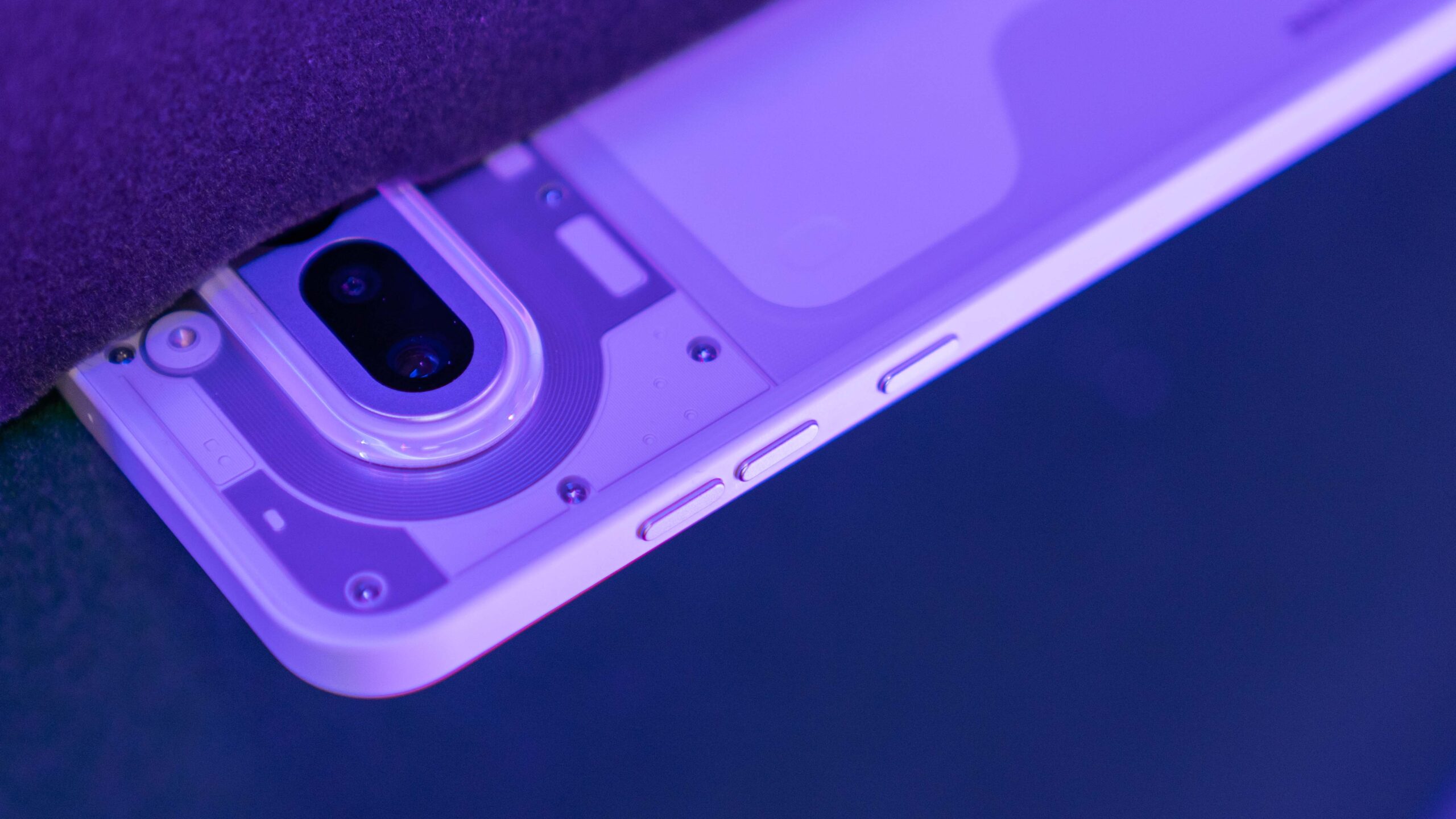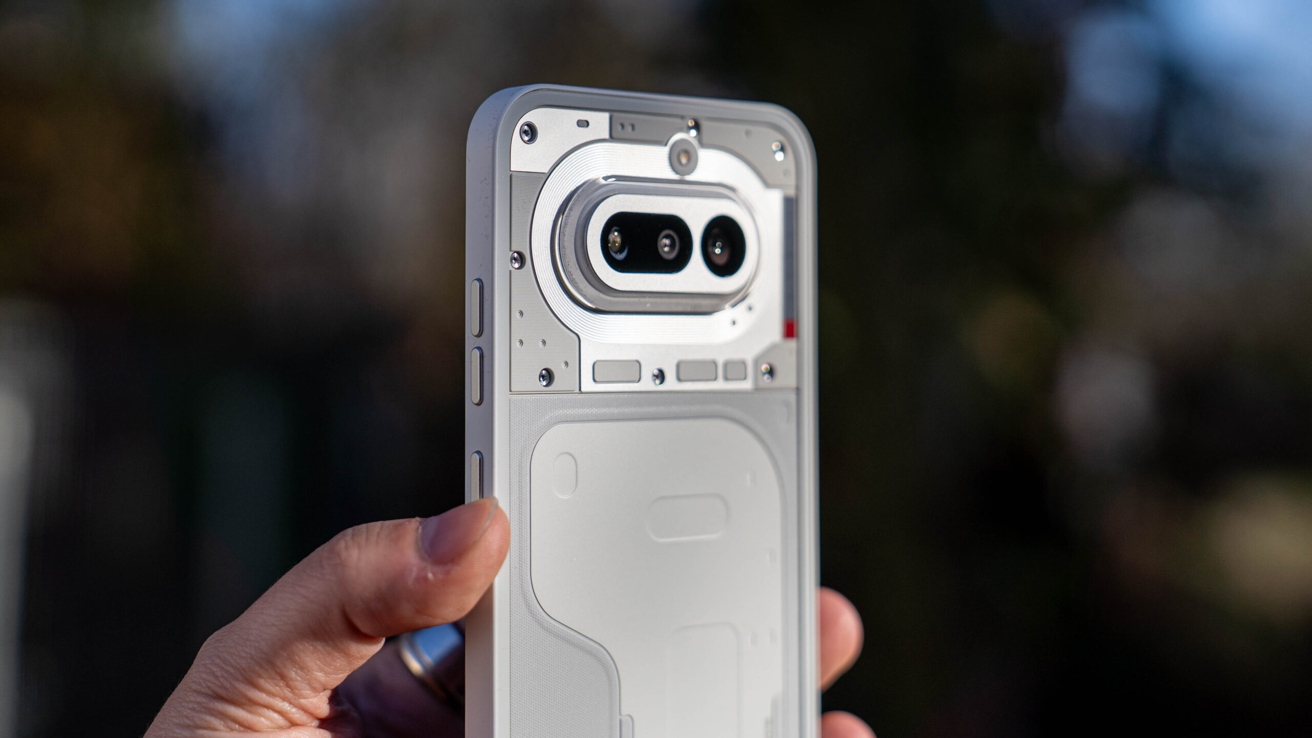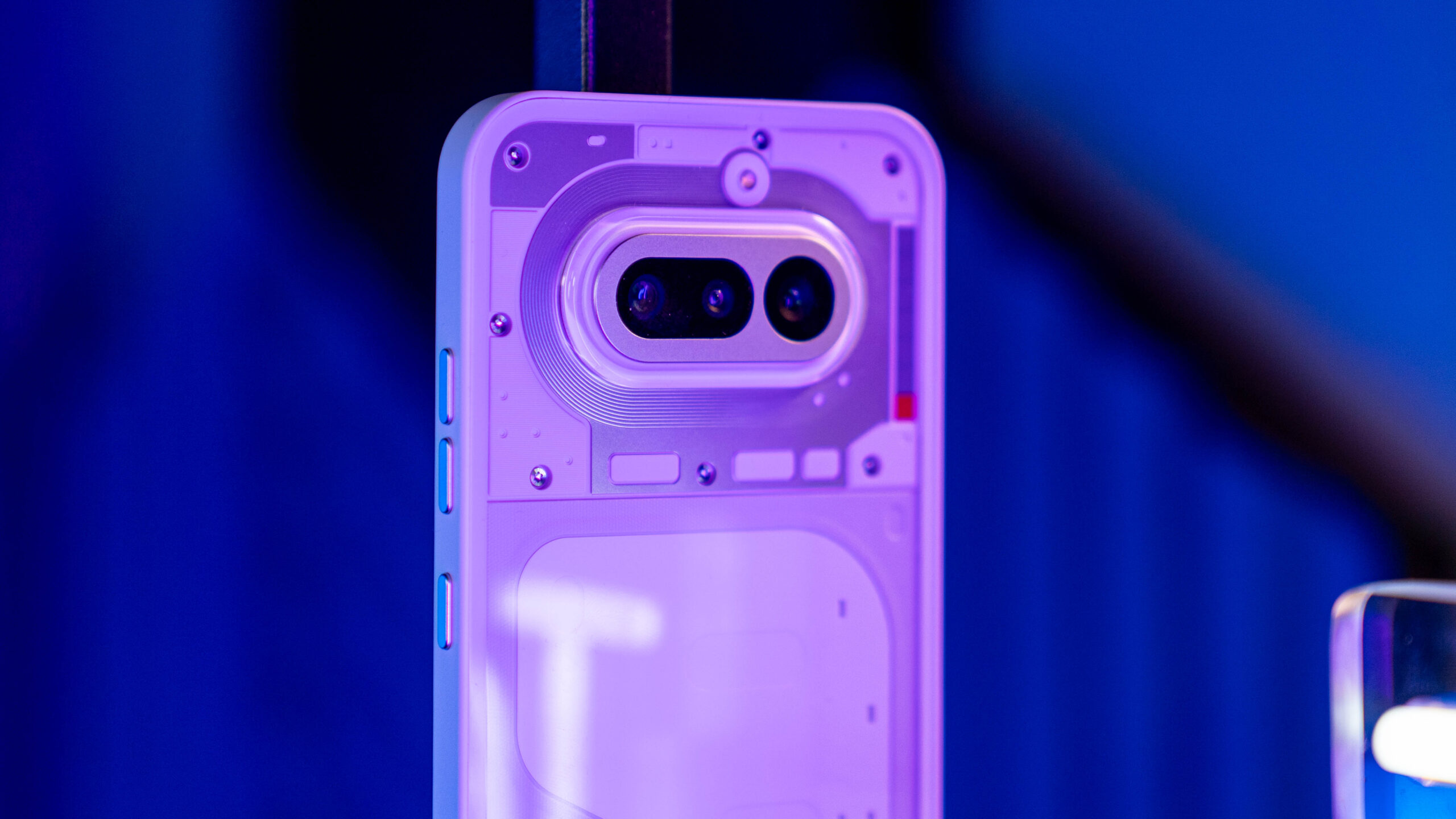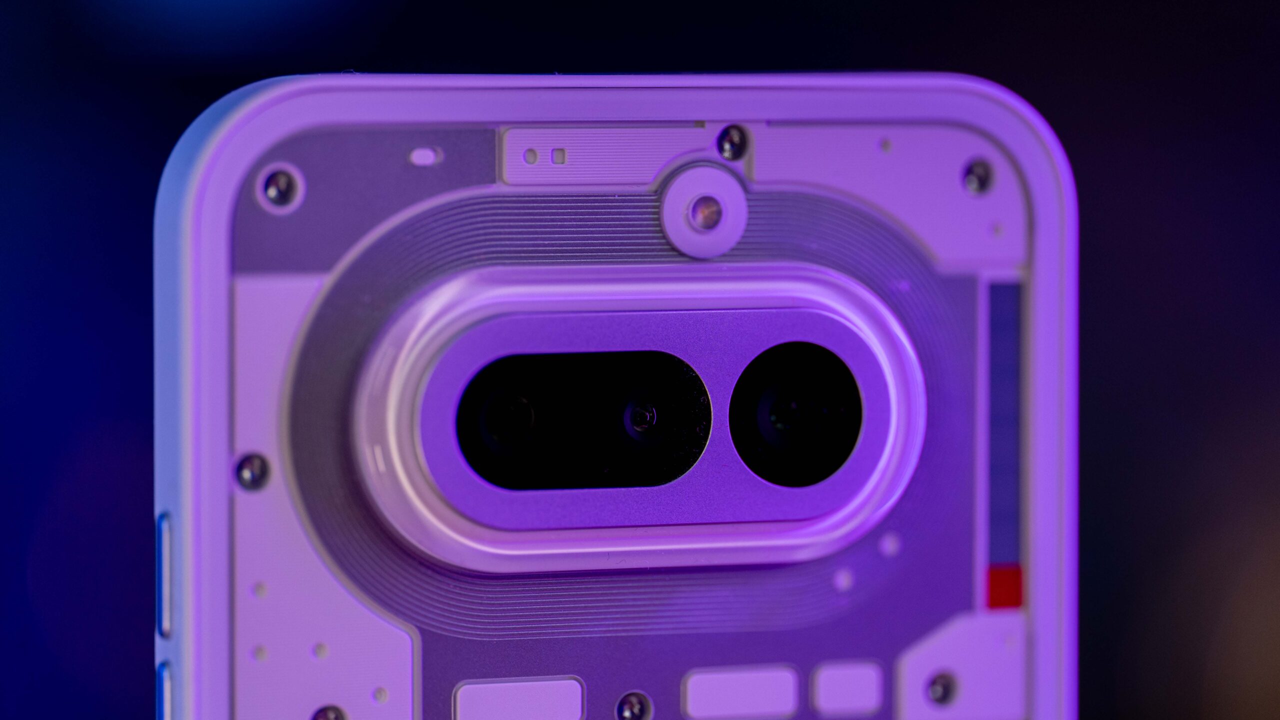 Do testów trafił mi się klasyczny, biały wariant urządzenia. I choć to właśnie wokół różowej wersji z jej intrygującymi odcieniami na pleckach narosło najwięcej szumu, biały model ma w rękawie świetnego asa: czerwoną diodę informującą o nagrywaniu wideo, która na jasnym tle fenomenalnie kontrastuje i od razu przyciąga wzrok. Elementem wyróżniającym jest tu oczywiście świecący, nieco kanciasty Glyph Bar. Każda z diod posiada trzystopniową regulację jasności, co pozwala mi idealnie dopasować intensywność świecenia do pory dnia.